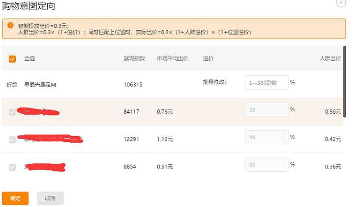 然后点开投放人群里面的购物意图定向,因为产品已经形成自己的标签,所以系统会根据产品的标签来给推荐一部分的关键词,我们需要做的就是把这些全部选择投放,也是出一样的溢价后面根据关键词的表现来通过对溢价的调整,从而达到更好的效果。设置好关键词之后也是把手机端所有的投放入口全部打开,设置同样的溢价,也是通过后期调整溢价来进行优化。