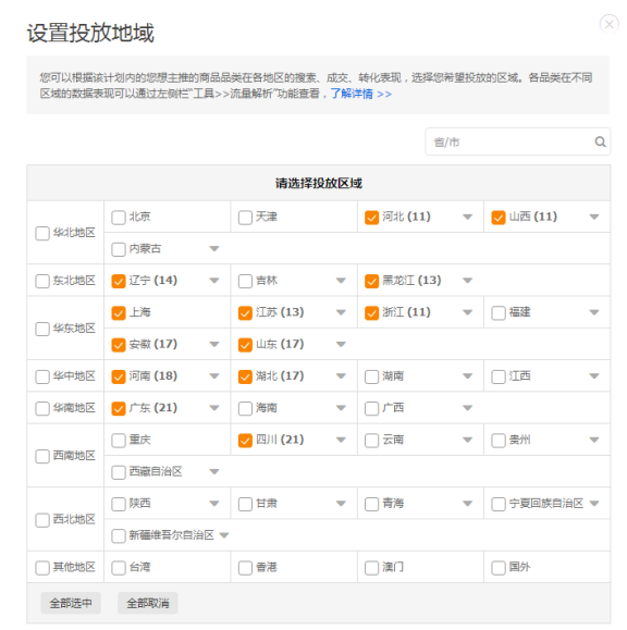 做完了这些我们要选择我们的投放平台,只选择移动站内推广,投放时间呢一般刚开的话,我们深夜开个30折扣左右,其他时间开100折扣,具体的我们根据后面的数据来优化,地域的选择我们把港澳台跟偏远地域去掉,然后其他都开着,后面我们在根据数据反馈,去分析访客,然后在选择合适的地域。