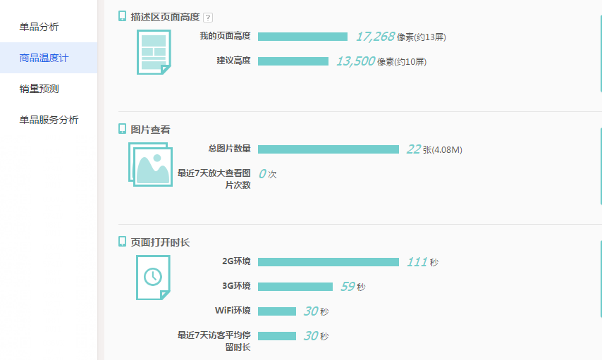如上图所示商品无线详情最近7天平均停留时间30秒,这个算合格的。但是详情的打开速度wifi环境都要30秒才完全打开,这个就有点慢了,无线的详情wifi环境打开速度10-15秒左右为正常。所以我们需要优化详情的打开速度。继续往图片上面可以看到我的页面高度17286像素,官方推荐13500像素,我们自己的超过3000像素左右。通过这个数据可以告诉我们只需要删除几张不好的图片就可以降低页面加载时间。这是已经上架的宝贝的数据展示。